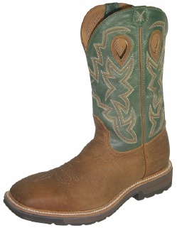 Twisted X Men's' Pull On Work Lite boot in Distressed Shoulder Leather Foot and 12 Inch Green - waterproof Leather Top featuring a Twisted X Cowboy Comfort Cushion Insole for all day comfort. This boot also features a New Wide Steel Toe with Molded Unit Block Heel and Oil and Slip Resistant Rubber Outsole for long wear. OK, here’s what you’ve been waiting for; we’ve done it. What many said couldn’t be done; a wide square, light weight steel toe boot that doesn’t make your feet look like Herman Munster’s feet. The toe profile is low and the boots look like cowboy boots. Just as our original cowboy work boots, our lightweight cowboy work boots have the same cool features except the weight is about 15% less. You’re gonna like these bad boys. Twisted x Boots from Lonestar Boots offering the best price and service. Get your boots from Lonestar boots where the owner has over 25 years of boot experience and is willing to get you the best price possible.